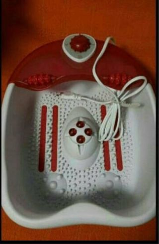 Masajeador de pies con diseño ergonómico y múltiples funciones para relajación. - Base con rodillos para masaje. - Diseño en color blanco y rojo. - Incluye cable de alimentación.