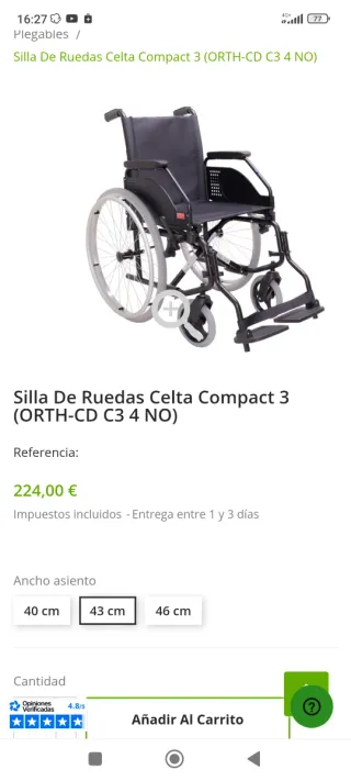 Silla de ruedas Celta Compact 3, modelo ORTH-CD C3 4 NO. Es plegable y fácil de transportar. - Ancho de asiento: 43 cm - Color: Negro - Incluye reposapiés