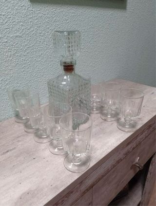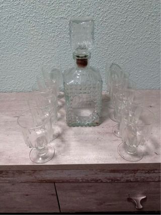 Elegante juego de licor con un diseño único. - Botella con tapón decorativo. - Incluye varios vasos a juego.