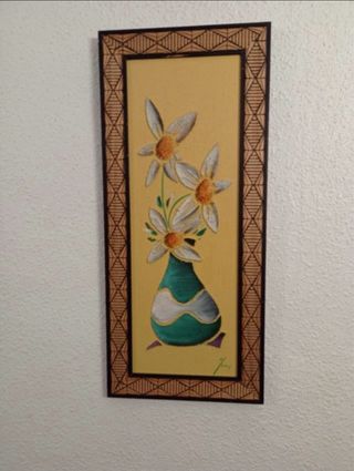 Conjunto de tres cuadros decorativos con un diseño floral. - Marco de madera con detalles. - Lienzo con flores blancas y jarrón verde.