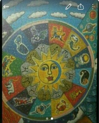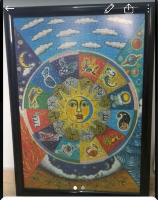 Precioso cuadro tipo puzzle con temática del zodiaco y el sol. - Diseño circular con los signos del zodiaco. - Representación del sol en el centro. - Colores vibrantes y detallados.