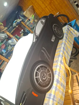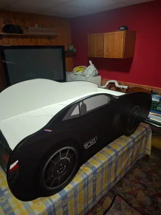 Divertida cama infantil con diseño de coche deportivo. - Estructura resistente. - Detalles de ruedas y alerón. - Acabado en negro brillante.