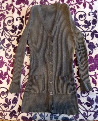 Jersey de punto fino en color gris oscuro. Presenta un diseño de canalé vertical y cierre de botones. - Cuello en V. - Dos bolsillos delanteros. - Puños y bajo acanalados. Envíos desde 5€