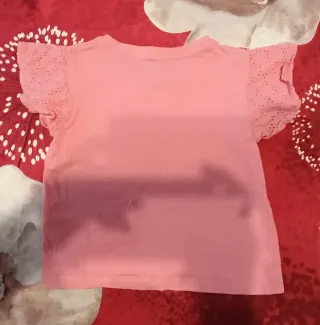 Camiseta de manga corta para niña, talla 4/5 años. Color rosa. - Mangas con detalle de puntilla y volantes. - Cuello redondo.
