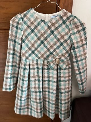 Vestido de Mayoral con un bonito estampado de cuadros. - Diseño de cuadros en tonos verde, marrón y blanco roto. - Manga larga. - Detalle de lazo en la cintura. - Falda con pliegues.