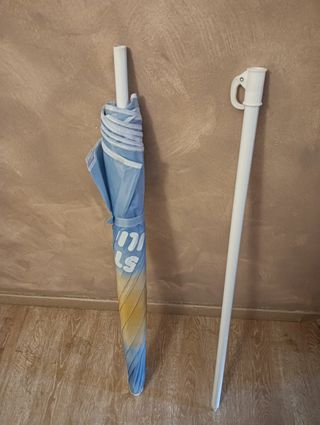 Sombrilla de playa con funda protectora. Sólo usada 2 o 3 veces - Funda de tela con cierre de cordón. - Correa de transporte. - Diseño con rayas verticales.