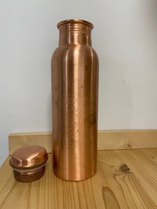 Botella de cobre con un diseño grabado en la superficie. - Material: Cobre - Diseño: Flor de la vida
