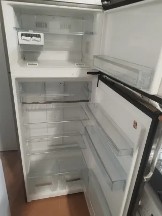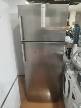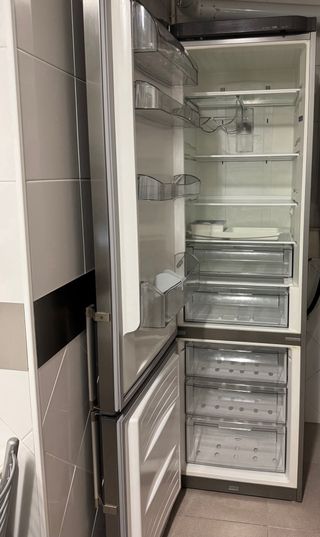 Nevera combi de la marca Fagor con acabado en acero inoxidable. - Diseño moderno y elegante. - Puerta con tirador integrado. - No Forst