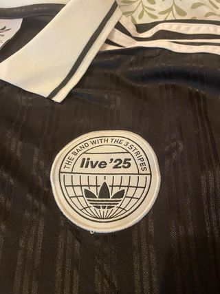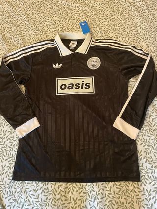 Camiseta de manga larga de la marca Adidas, con diseño inspirado en Oasis. - Color negro con detalles blancos. - Cuello tipo polo. - Puños blancos. - Logo de Adidas y de Oasis. - Diseño con rayas verticales.