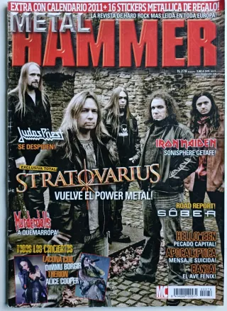 Revista número 278 de la edición española de Metal Hammer, publicada en enero de 2011. Reportaje sobre Stratovarius y su regreso. Iron Maiden (concierto Sonisphere Getafe), Judas Priest, Murderdolls, Alice Cooper, Helloween, Apocalyptica, Lacuna Coil, Dimmu Borgir, Therion, Cuatro Gatos, Banzai,Los Suaves entre otros. Póster calendario del año 2011 con famosas portadas de discos.