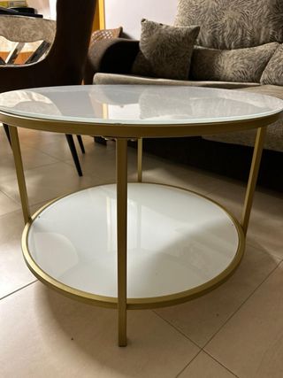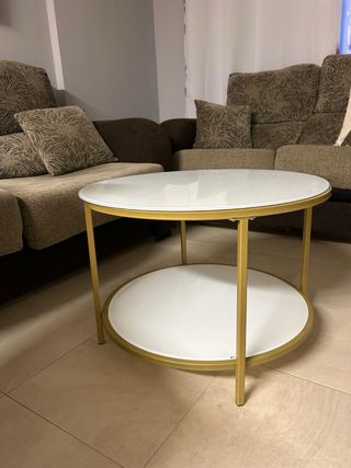 Elegante mesa de centro redonda con un diseño moderno y funcional. Perfecta para complementar tu sala de estar. - Tablero superior de cristal blanco. - Estructura y patas de metal en acabado dorado. - Segunda balda inferior de cristal blanco. Diámetro 0,64 metros Altura 0,45 metros Es del JYSK, se vende por cambio de vivienda. Disponible en Ribadeo y Madrid. (Esta en Ribadeo pero puedo bajarla cualquier fin de semana)