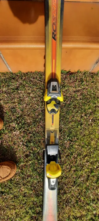 Se venden esquís con fijaciones. Son de la marca Rossignol. Miden 1,60. Con la compra se regala 1 casco. - Diseño llamativo con detalles naranjas y amarillos. - Fijaciones de esquí amarillas y negras.