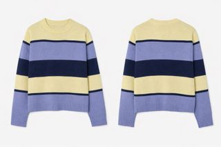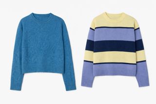 Pack de dos jerseys. - Jersey azul liso crop top, talla M (stradivarius) - Jersey de rayas multicolor (amarillo, azul claro, azul marino), talla S (Shein)