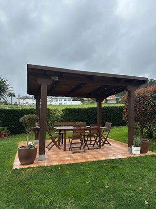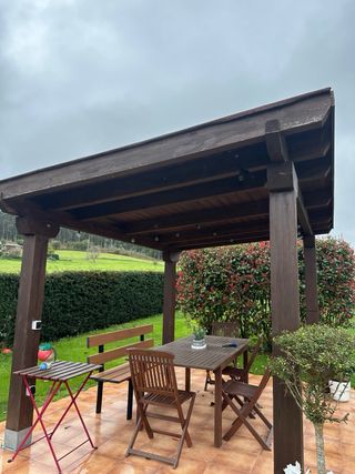 Porche o pérgola de madera, ideal para exteriores. Proporciona un espacio cubierto y acogedor en tu jardín. - Estructura robusta de madera. - Diseño de techo a dos aguas.