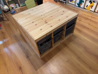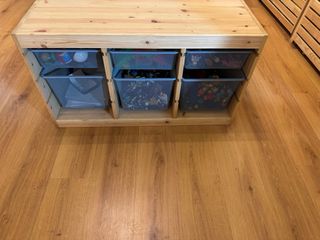 Mueble de almacenaje de IKEA modelo Trofast, perfecto para organizar juguetes y otros objetos. - Estructura de madera de pino. - Incluye varias cestas de rejilla. - Diseño modular y funcional.
