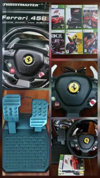 Volante de carreras Ferrari 458 Italia para Xbox 360. Incluye su caja, el volante, los pedales y 6 juegos de coches y motos. El volante está practicamente nuevo con apenas uso y guardado en su caja. - Caja original del volante. - Diseño inspirado en el Ferrari 458 Italia. - Compatible con Xbox 360. - Incluye pedales de acelerador y freno. Los juegos incluidos son: Forza Motorsport 4, Forza Motorsport 3, Need for Speed Hot Pursuit, Moto GP 06, Superbike World Championship SBK X y Project Ghotam Racing PGR 3 Envíos por wallapop. Se puede adquirir solamente el volante por 40 euros.