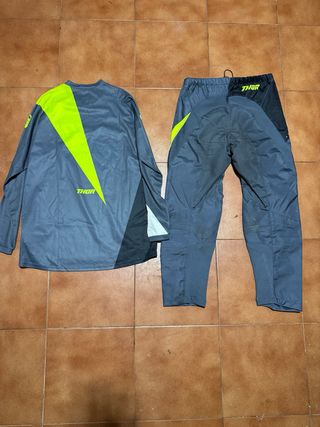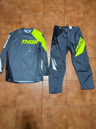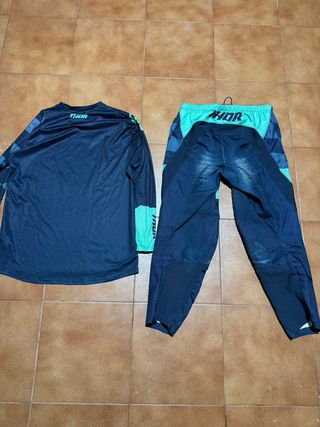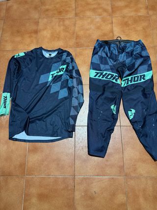 Conjunto de equipación para enduro o motocross de la marca Thor. Incluye camiseta talla L y pantalón talla 34. - Diseño a cuadros en tonos grises y verde menta - Logo de Thor visible en camiseta y pantalón