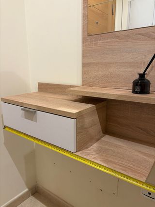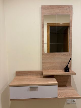 Mueble de recibidor con un diseño moderno y funcional. - Acabado en madera clara. - Cajón blanco. - Espejo integrado con marco de madera. - Estante superior. - Estante inferior. -Las medidas aparecen en las fotos. - Tiene 30 cm de fondo.
