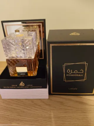 Perfume Lattafa Khamrah, sin estrenar, en su caja original. - Fragancia Eau de Parfum. - Capacidad de 100ml. - Diseño de frasco elegante y moderno. - Caja con detalles dorados.