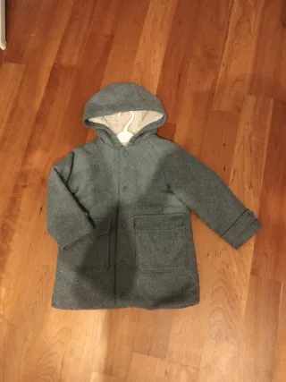 Chaquetón gris con capucha para niña de 4 a 5 años. Ideal para mantenerla abrigada. - Cierre de botones. - Dos bolsillos delanteros. - Forro interior suave.