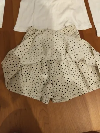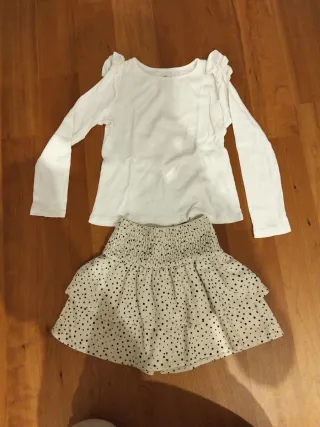 Conjunto de camiseta blanca de manga larga y falda con estampado de lunares negros. La camiseta tiene volantes en los hombros y la falda es de vuelo con dos capas. - Camiseta blanca manga larga. - Falda con estampado de lunares. - Talla 7-8 años.
