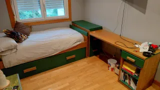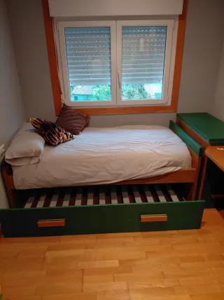 Conjunto de muebles para habitación infantil o juvenil. - 2 camas nido con somier y colchón - Escritorio integrado. - Mueble con cajón de corredera - Acabado en madera y verde. Recoger en domicilio Graciasss