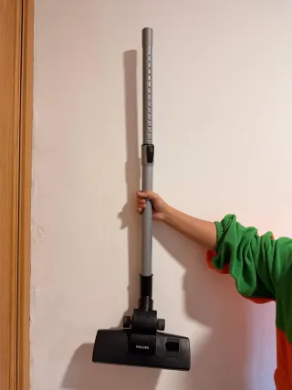 Tubo telescópico y accesorio de aspiradora de la marca Philips. El tubo es extensible y el accesorio es el cepillo principal. - Tubo telescópico gris. - Accesorio de suelo negro con logo de Philips.