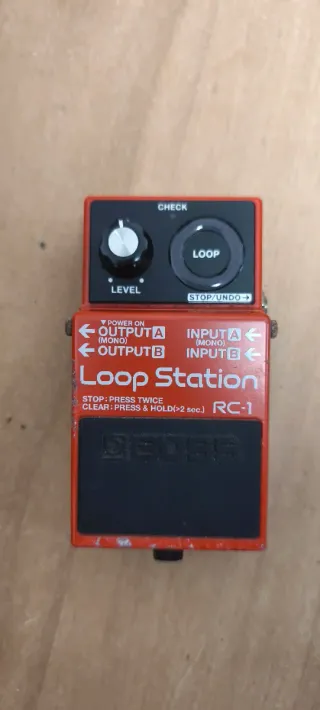 Pedal de efectos Boss RC-1 Loop Station. - Controles: Level, Loop. - Indicador LED. - Entradas: Input A (Mono), Input B. - Salidas: Output A (Mono), Output B. - Funciones: Stop (doble pulsación), Clear (mantener pulsado >2 seg.).