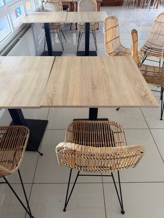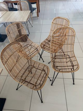 Conjunto de cuatro sillas de diseño moderno con estructura de metal y acabado en ratán. - Estilo contemporáneo. - Patas metálicas negras. Tenemos 20 sillas se puede vender por lote o unidad El precio es por pack de 4 sillas