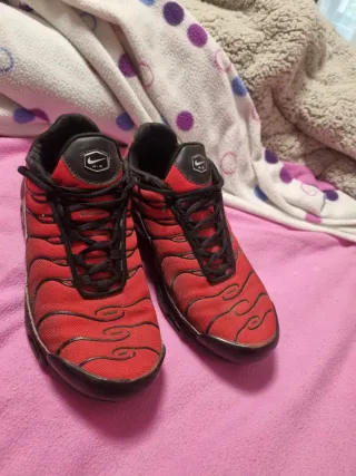 Zapatillas Nike TN con un diseño inspirado en Deadpool. - Color principal rojo con detalles en negro. - Talla 43.