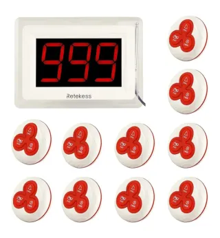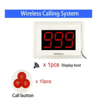 Sistema de llamadas inalámbricas Retekess T114. - Incluye 1 receptor y 10 transmisores. - Transmisores con botones de llamada, pago y cancelación. - Receptor con pantalla digital.