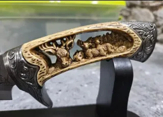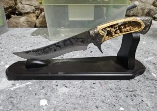 Elemento de colección con un diseño intrincado y detallado. Ideal para exhibición. - Hoja con grabados de paisaje. - Empuñadura con tallado de ciervos. - Soporte de exhibición incluido.