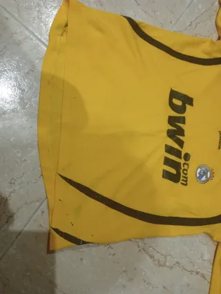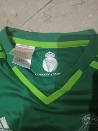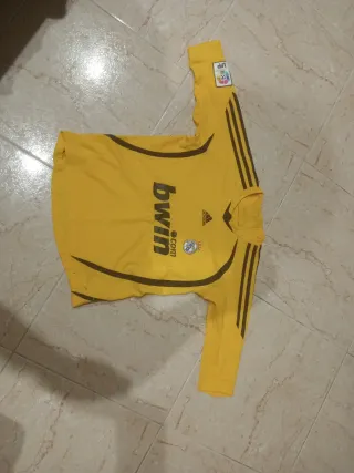 Camiseta de portero del Real Madrid para niño. - Color amarillo. - Manga larga. - Logo de Adidas. - Escudo del Real Madrid. - Parche de La Liga. Está usada y no veo bien la talla pero correspondria a niños entre 8/10 años. Tienes algunos enganchones en la parte de atrás(no se notan mucho) yen una de las fotos podréis ver que se le ha borrado algo que tenía escrito(lado derecho abajo) pero es poca cosa