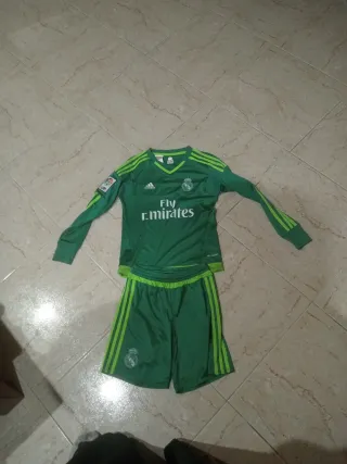 Conjunto de fútbol para niño del Real Madrid. - Camiseta de manga larga. - Pantalón corto. - Diseño en color verde con detalles en verde claro. - Escudo del equipo. - Logo de la marca. Lo único que tiene es el detalle de las letras que se le ha borrado la E.