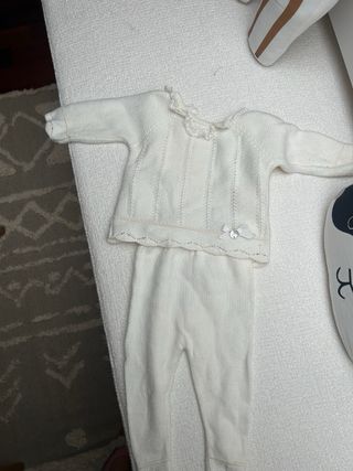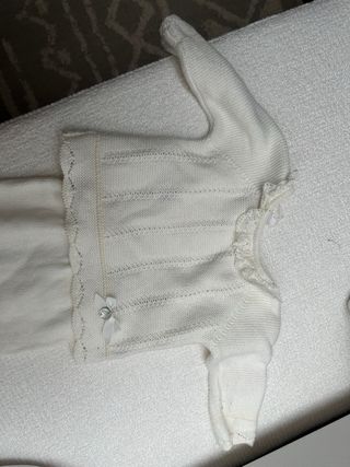 Conjunto de jersey y polaina de punto en color blanco, ideal para bebés de 3 meses. El jersey tiene un diseño delicado con detalles calados y un pequeño lazo con un brillante. Marca paz rodriguez - Jersey de punto blanco. - Polaina a juego. - Talla 3 meses.