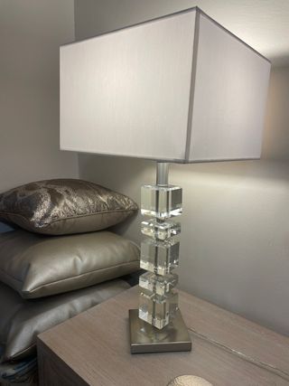 Elegante lámpara de mesa con un diseño moderno y sofisticado. Su base cuadrada y el cuerpo apilado de cubos de cristal le dan un toque de distinción. ZARA HOME - Cuerpo apilado de cubos de cristal. - Base y detalles metálicos. - Pantalla rectangular blanca de tela.