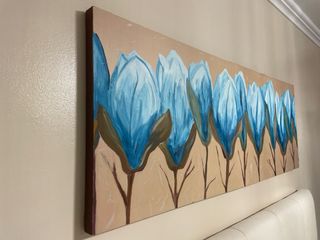 Precioso cuadro pintado al óleo con un diseño de flores en tonos azules y beige. - Pintura sobre lienzo tintado.