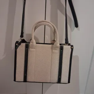 Bolso de mano con correa de hombro desmontable. Diseño moderno y práctico. - Material textil con detalles en piel sintética. - Dos asas cortas para llevar en la mano. - Correa larga ajustable para el hombro. - Cierre superior.