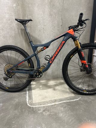 Bicicleta Orbea Oiz en talla L. Diseñada para un rendimiento óptimo en montaña. - Cuadro de carbono. - Suspensión delantera y trasera fox con mantenimientos hechos, hoquilla con pequeño salto del recubrimiento del kashima en la parte superior. - Ruedas carbono mavic crissmax - Transmisión xx1