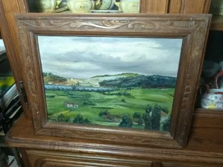 Pintura original al óleo sobre cartón del artista Fermín González Prieto. - Paisaje rural con río y colinas. - Marco de madera tallada.