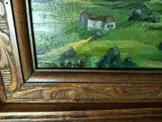 Cuadro de óleo sobre cartón con un marco decorado. - Marco con incrustaciones de concha. - Marco con detalles bonificados.