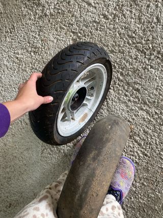 Juego de dos ruedas para Jog RR. - Llanta delantera blanca con detalles en amarillo. - Llanta trasera plateada. evidentemente una de las ruedas no se podría usar , pero la llanta está perfecta