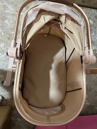 Cochecito ligero y práctico para transportar a tu mascota. - Color beige y detalles en dorado. - Capota con malla transpirable. - Asas de cuero sintético.