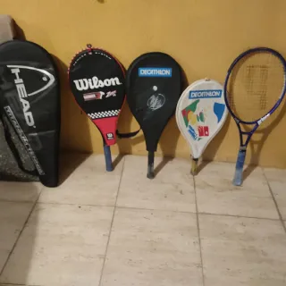 Conjunto de cinco raquetas de diferentes marcas y estilos, ideales para tenis o bádminton. - Raqueta HEAD Titanium. - Raqueta Wilson Hammer. - Raqueta Decathlon. - Raqueta Decathlon. - Raqueta de tenis azul y blanca.