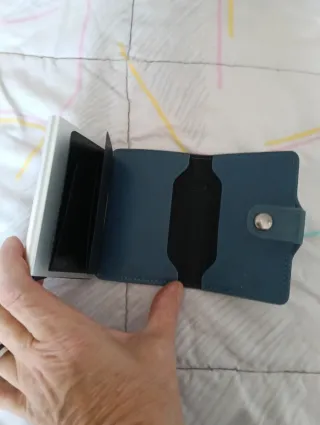 Elegante tarjetero con mecanismo automático. - Exterior de piel. - Interior de metal.
