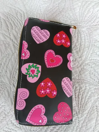 Monedero grande con un divertido estampado de corazones. - Diseño con múltiples corazones en rosa y rojo. - Cierre de cremallera.