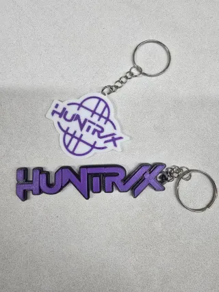 llaveros con el logo de Huntrix. - Llavero con diseño de nube y logo Huntrix en morado y blanco. - Llavero con letras Huntrix en relieve, color morado. Precio de cada llavero 3€ Los dos 5€ Se hacen envíos