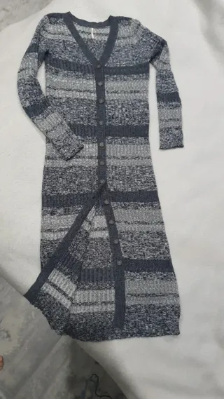 Vestido largo (altura gemelo) de punto con un diseño de rayas en diferentes tonos de gris. Calentito, suave e ideal para el invierno. Estiliza muy bien la silueta. Talla M - L ya que se adapta muy bien. Cierre de botones en la parte delantera.Manga larga. 31% de algodón.