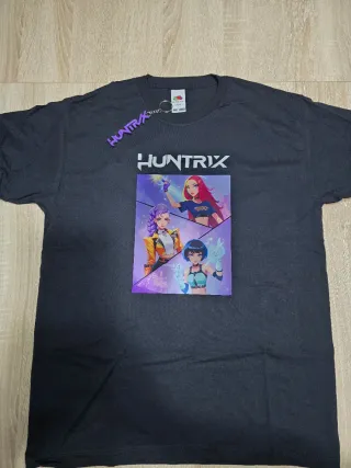Conjunto de camiseta negra y llavero con el logo de Huntrix. - Camiseta con estampado frontal de Huntrix. Talla 12-13 - Llavero morado con el nombre de Huntrix.