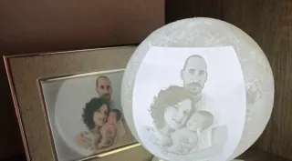 Lámpara de mesa con diseño de luna, ideal como detalle o regalo. - Personalizable con fotografía. - Base de madera.